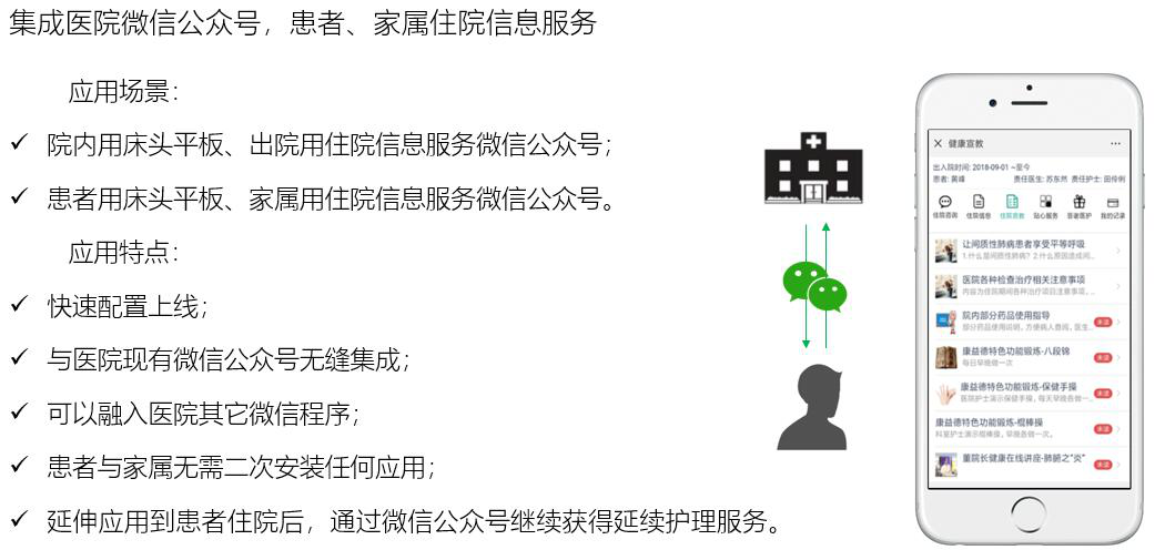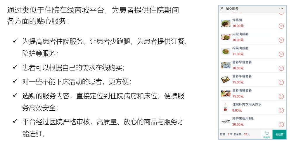 拓展床旁醫(yī)護、營養(yǎng)點餐、患者貼心服務、醫(yī)患交流、住院宣教、健康指導等功能,改善住院服務流程,改善患者就醫(yī)體驗,優(yōu)化醫(yī)患交互,改善醫(yī)療服務模式,提升智慧醫(yī)療的效率和水平。