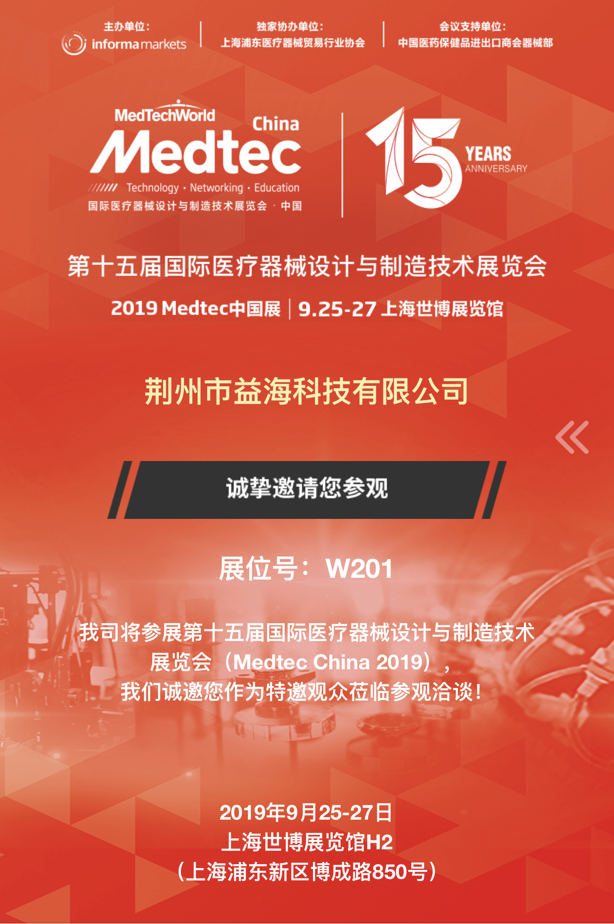 我司將參展第十五屆國(guó)際醫(yī)療器械設(shè)計(jì)與制造技術(shù)展覽會(huì)(Medtec China 2019),展位號(hào):W201.我們誠(chéng)邀您作為特邀觀(guān)眾蒞臨參觀(guān)洽談!