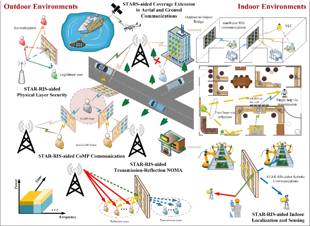 STARS 具有非常廣泛的應(yīng)用場景,比如在 STAR: Simultaneous Transmission and Reflection for 360° Coverage by Intelligent Surfaces 中所列舉的 STARS-NOMA 蜂窩網(wǎng)絡(luò),工業(yè)通信場景,室內(nèi)/室外信號增強以及海上通信等諸多應(yīng)用場景。例如:
