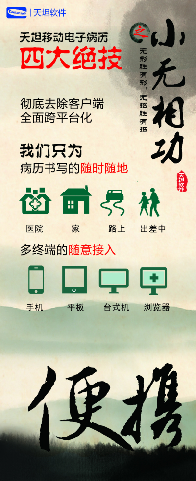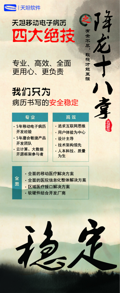 天坦軟件,作為國內(nèi)移動電子病歷的先行者,盛裝亮相京交會。在會上展示了以“天坦移動電子病歷”為核心的醫(yī)院整體信息化系統(tǒng),受到眾多參觀者的關(guān)注。天坦軟件始終堅持以“讓天下沒有難看的病”為宗旨,致力于醫(yī)療事業(yè)發(fā)展。為中國醫(yī)療衛(wèi)生行業(yè)的信息化建設(shè)以及個人健康服務(wù)提供從硬件到軟件、從技術(shù)到服務(wù)的全面解決方案,是中國醫(yī)療信息化市場中快速成長的獨立軟件廠商之一。數(shù)年來,一直堅持研發(fā)以移動電子病歷為核心的醫(yī)院信息化系統(tǒng),從移動框架的病歷編輯器到跨平臺的移動醫(yī)療解決方案,為整個病歷信息化行業(yè)注入了極強的創(chuàng)新活力。 “天坦移動電子病歷”為核心的醫(yī)院整體信息化系統(tǒng)秉承“高效應(yīng)用、信息互通”的基本理念,是專門為醫(yī)院設(shè)計開發(fā)的醫(yī)療信息化系統(tǒng)的核心組成部分。具有高效、安全、穩(wěn)定、易用、移動、智能等特點,除此之外,還具有穩(wěn)定、完全跨平臺運行、功能強大、系統(tǒng)性能卓越等巨大優(yōu)勢。