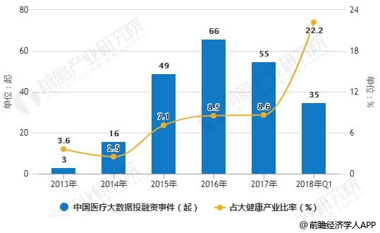 2013-2018年Q1中國醫(yī)療大數據投融資事件及占大健康產業(yè)比率統(tǒng)計情況