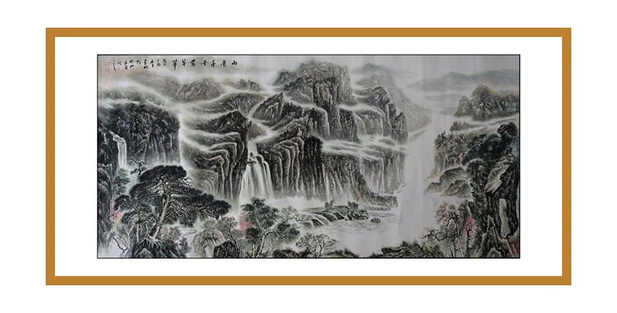 欣賞譚老的畫作,使人有一種難以言表的美感,問及原因,他說:“為了研究山水,我閱讀了大量古、今書籍,我發(fā)現(xiàn)歷朝歷代對(duì)山水國畫都相當(dāng)重視,山水被視為鎮(zhèn)宅的代名詞,一直以來在帝王家它都是以圖騰的形式存在的。”但為了能夠更好地傳承歷史文化,他鉆研國學(xué),將儒、釋、道的精髓理念及思想融入到作品中,追求創(chuàng)造的是一種“和合”之感,讓這大氣之圖騰成為真正意義上的圖騰。